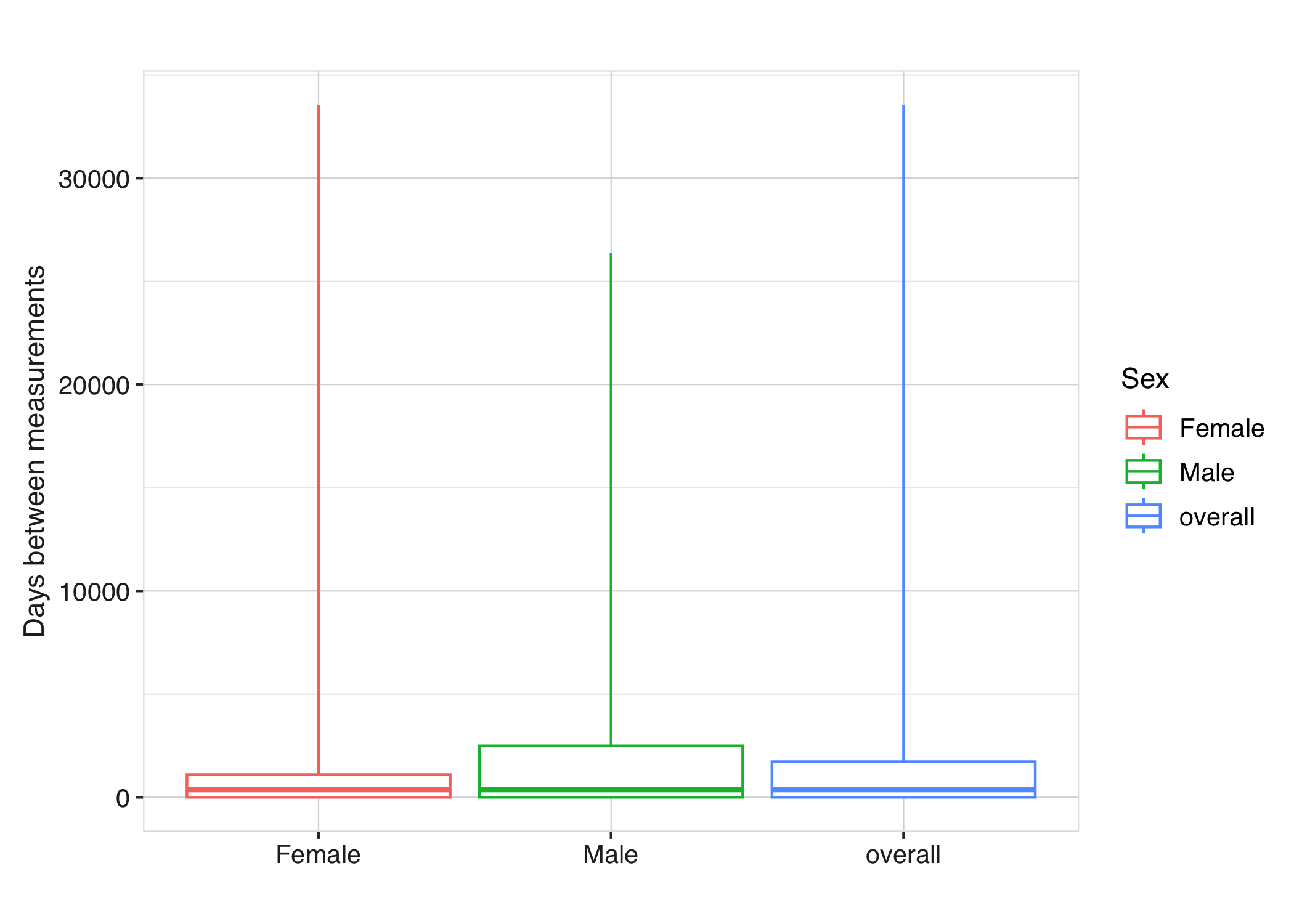 Each diagnostic result can also be visualised using plotting functions. For instance, the time between measurements can be displayed using boxplots: