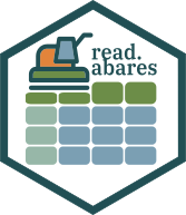 ABARES makes several data sets freely available as spreadsheets in Microsoft Excel or CSV file formats and zip archives of geospatial data as NetCDF, GeoTIFF or shape files. {read.abares} facilitates downloading and importing these files in your R session.